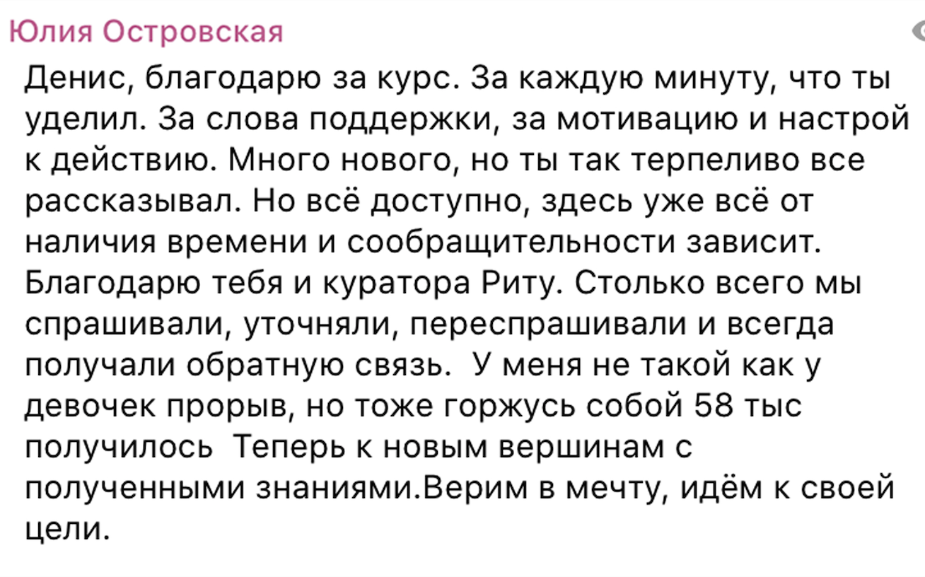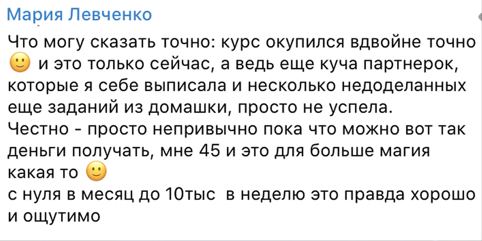 В результате этого модуля у вас готовое понимание заработка на партнерских ссылках, готовая стратегия, выбранные программы, первая практика получения денег на партнерском маркетинге. Вы понимаете как масштабироваться, за счет разных каналов трафика. У вас пошаговые инструкции где найти программы и доход, который будет расти от месяца к месяцу.